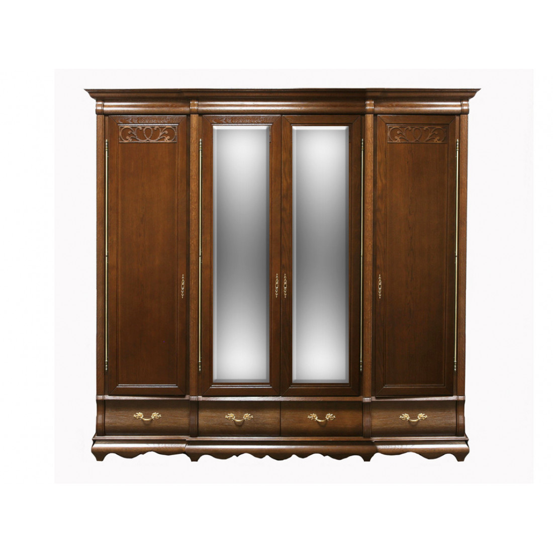 Массивный четырехдверный шкаф для спальни из коллекции "Оскар" органично впишется в интерьер в классическом стиле. Центральные двери имеют встроенные зеркала. Высокие карнизы и романтичный резной узор придают модели изящества. Выдвижные бельевые ящики на направляющих. Фасад выполнен из массива дуба, модель окрашена в классический оттенок "Орех".